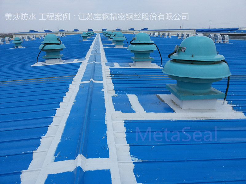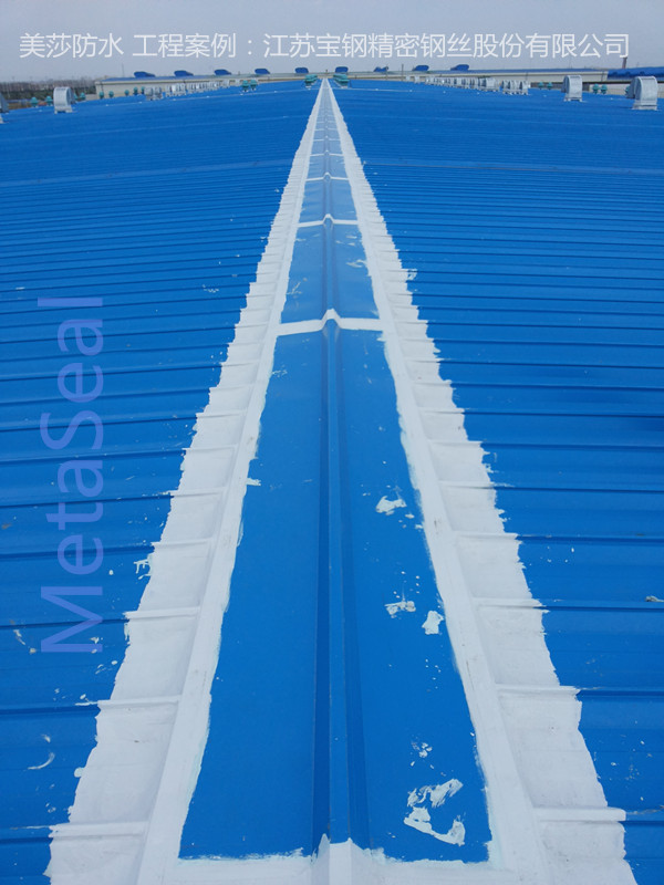 位于南通市海門開發區,由上海十三冶承建的江蘇寶鋼精密鋼絲有限公司,新建的鋼結構標準廠房,總建筑面積44000平方米。項目驗收前期,屋面發現較多滲漏水點,安裝公司用硅膠進行修補,可沒過2個月就發現了很多新老漏點。經總工程師推薦,使用美莎金屬屋面防水體系,對于易滲漏水點較多的屋脊、通風器基座、排風設備基座、泛水收邊、伸縮縫等處,系統地防水維護,效果明顯。至今好幾年了,客戶反饋良好。