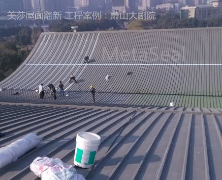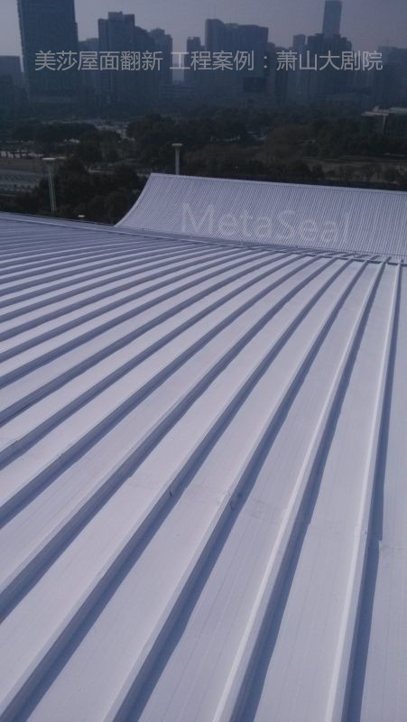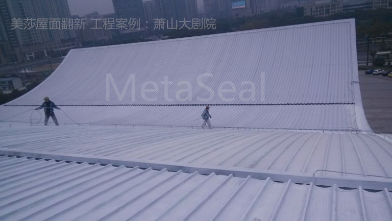 位于杭州市蕭山區的政府項目——蕭山大劇院,使用7-8年后,大劇院出現了不同程度的滲漏水,屋面及外立面也呈現老舊狀況。經過嚴格的招投標流程后,屋面翻新采用美莎金屬屋面防水體系+翻新體系,即將所有搭接縫進行防水密閉處理后,整個屋面噴涂美莎隔熱反光涂料(第二代),維護后煥然一新,效果明顯。