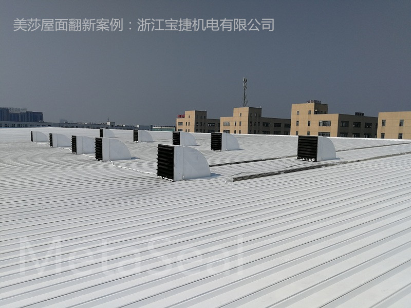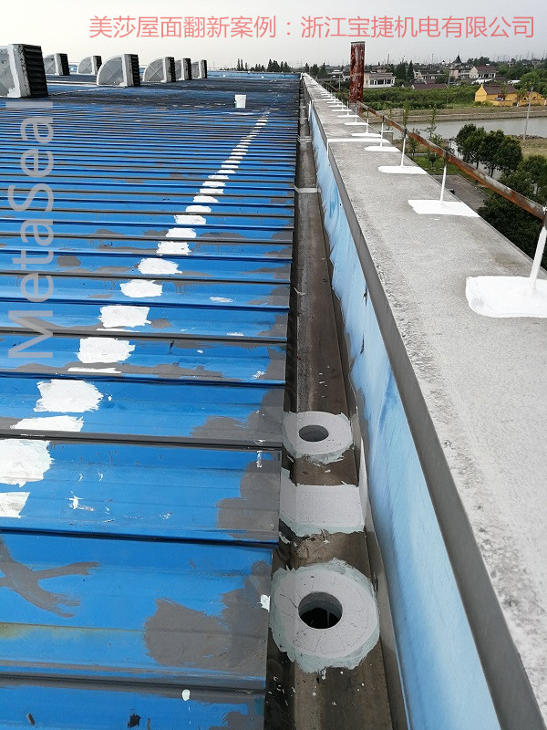 位于浙江省海寧市開發區的浙江寶捷機電有限公司,為一德國獨資企業。生產車間為鋼結構標準廠房,建筑面積14800平方米。由于生產車間排放的工業廢氣及粉塵(屋面后開了10個排風設備),對于屋面板產生腐蝕性,在使用五六年后,屋面出現不同程度的滲漏水情況及銹蝕,且日趨嚴重。之前業主曾找外面的防水施工單位,就通風設備區域用SBS瀝青防水卷材進行鋪設,一年后又滲漏水了,維修效果不理想。