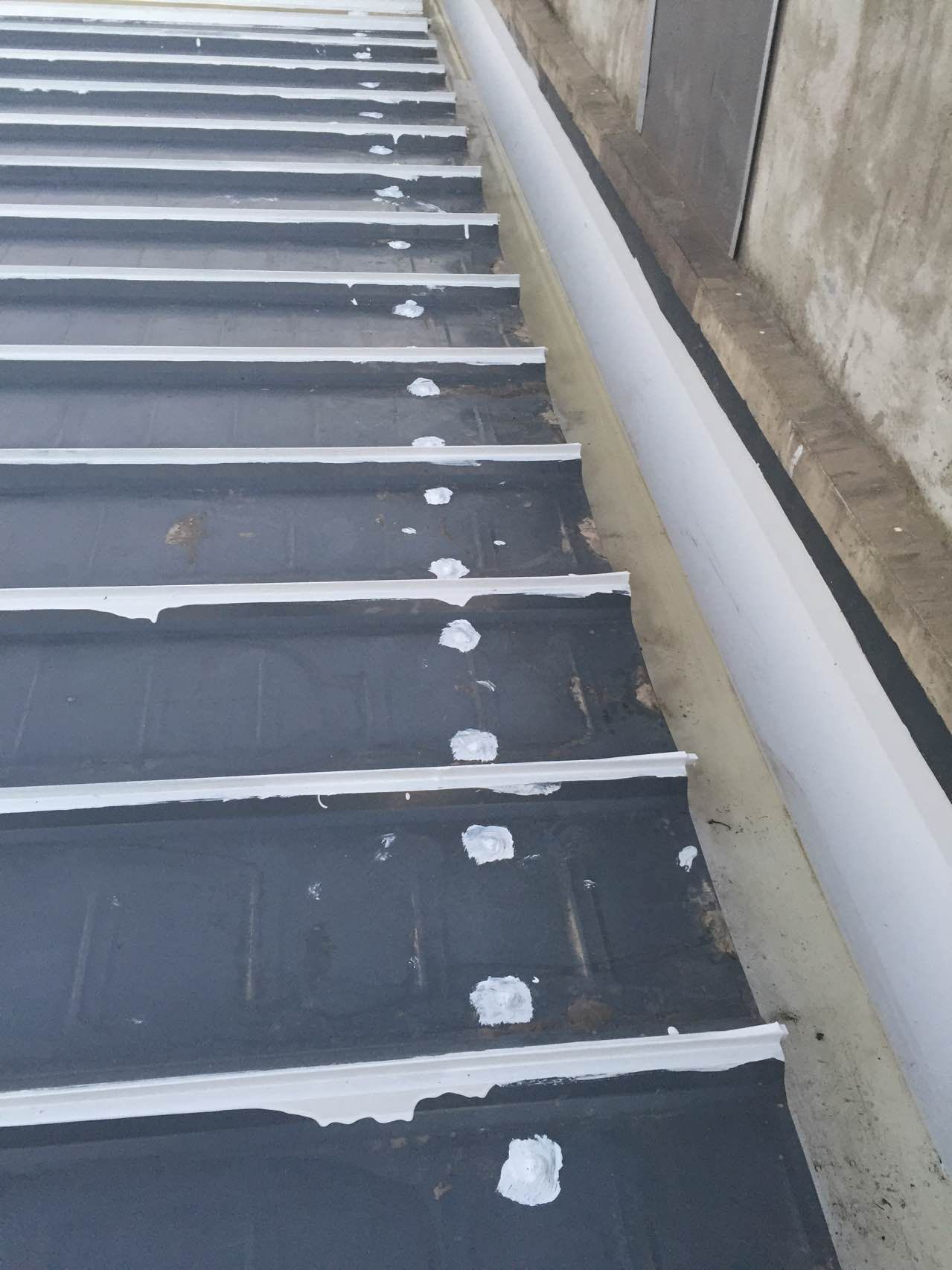 為了徹底解決屋面滲漏水的隱患,園區領導層,決定采用美莎金屬屋面防水涂料,對于屋面上的所有搭接縫、釘子和天溝,進行預先防水維護處理,確保屋面20年間平安無事。經過近3個多月時間的維護施工,總共搭接縫20萬多延長米,釘子也有幾十萬個,防水維護工作順利完成。后續就可以安心地安裝光伏板了。