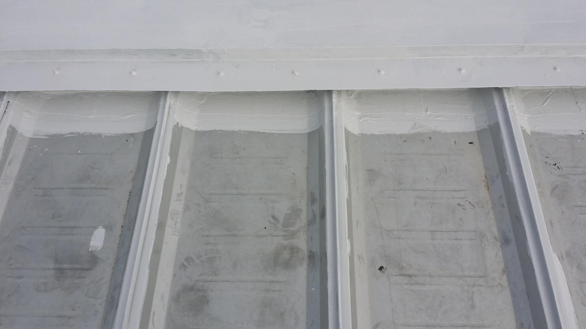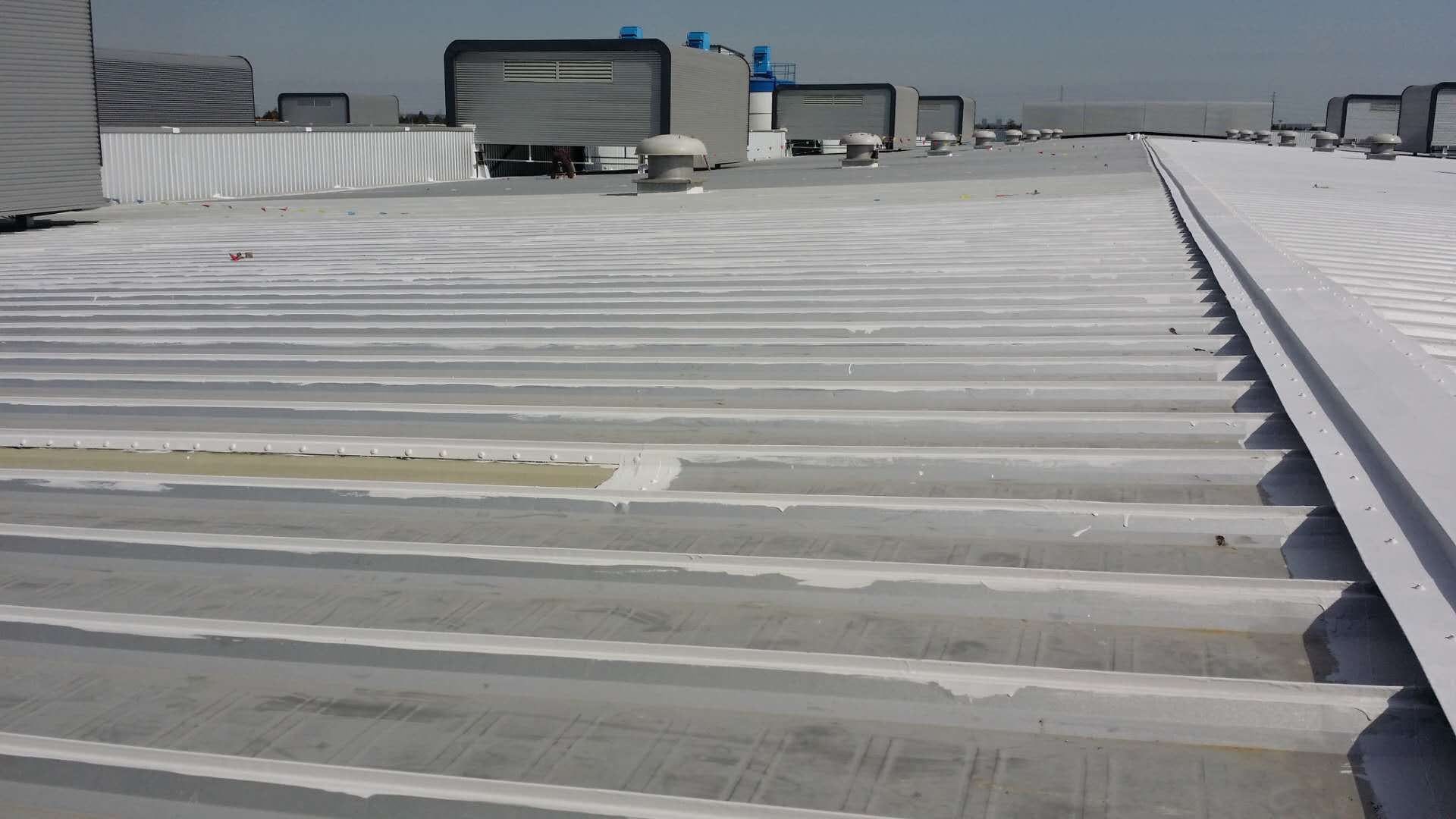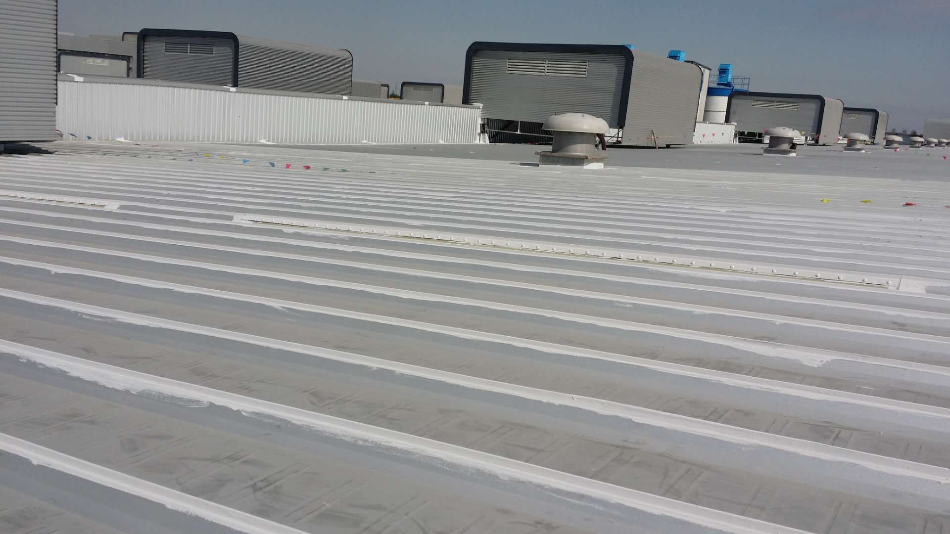 作為光伏板安裝的前道步驟——屋面防水維護工作,也在2017年10月初緊鑼密鼓地開始進行。由于先前臨港再制造產業示范園區項目的屋面防水維護全部選用美莎金屬屋面防水體系,應用效果不錯。這次項目也是全部選用美莎金屬屋面防水體系,將所有搭接縫、釘子及天溝等部位全部做防水維護處理,確保屋面15-20年期間無滲漏水的隱患。