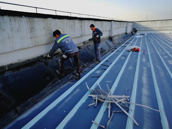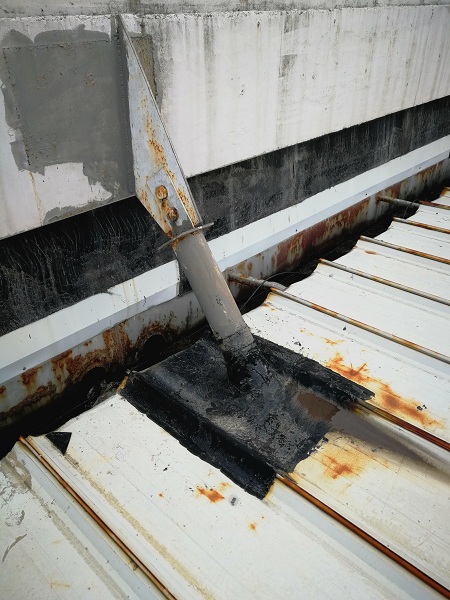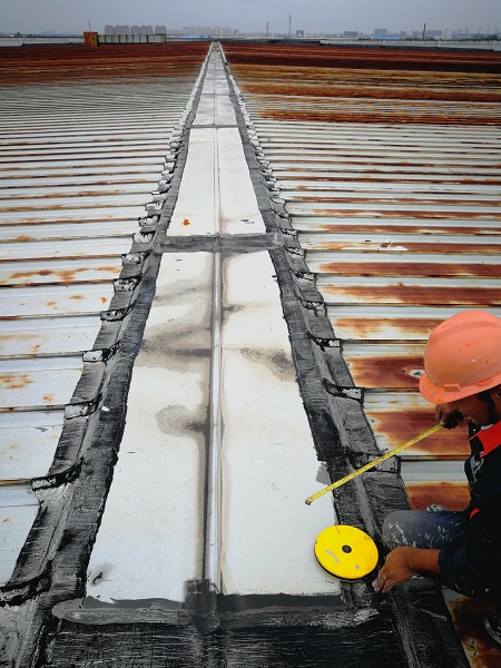 由于屋面跨度大,單坡70多米長,屋面熱脹冷縮拉伸應(yīng)力巨大,同時整張彩板無接頭,設(shè)備機(jī)組的柱角較多等諸多因素,導(dǎo)致了屋面出現(xiàn)了多處滲漏水,之前曾用瀝青防水卷材和硅膠修補(bǔ)過漏水,效果不理想。倉庫作為租戶的大型外貿(mào)倉儲中心,若因漏水而引起堆放貨物受損,且很容易會造成出口貨物的交貨期延誤,經(jīng)濟(jì)利益影響巨大。