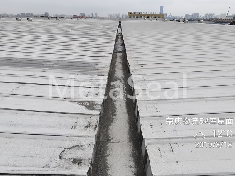 位于上海市嘉定區(qū)馬陸工業(yè)園區(qū)的榮慶物流基地5-6#庫(kù),兩棟舊倉(cāng)庫(kù)改建的冷鏈庫(kù),共11000平方米,普通角弛型彩涂板屋面結(jié)構(gòu)。維護(hù)前漏水問(wèn)題嚴(yán)重,對(duì)于存放大量高價(jià)值貨物的業(yè)主而言是無(wú)法接受的。