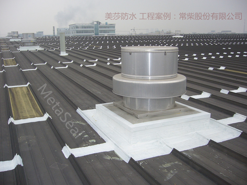 常柴股份公司多缸機(jī)廠房采用鋼結(jié)構(gòu)屋面,屋面面積約3萬平方米,建成至今已有近7年時(shí)間。由于鋼結(jié)構(gòu)屋面跨度大,屋面板連接處的膠泥、硅膠等材料老化,局部釘子松動(dòng)銹蝕,在竣工后5年左右時(shí)陸續(xù)出現(xiàn)多處漏水現(xiàn)象,已影響到工廠機(jī)器設(shè)備的正常運(yùn)用及日常生產(chǎn)。為了解決這些問題,業(yè)主曾采用SBS瀝青防水卷材對(duì)于漏水區(qū)域進(jìn)行滿鋪維修,但效果很不理想,公司在咨詢屋面專業(yè)人士后,決定采用MetaSeal美莎金屬屋面防水體系,對(duì)于屋面上的各板搭接縫部位、屋脊、風(fēng)機(jī)座、排煙(氣)管部位、天溝等部位進(jìn)行系統(tǒng)地防水維護(hù),收到了良好的效果。