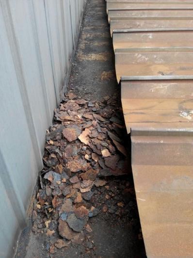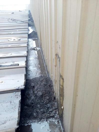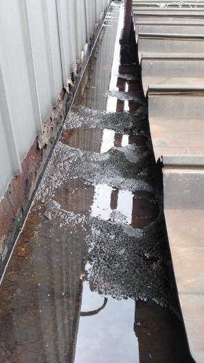 蘇州巨能發電配套設備有限公司的鋼結構屋面,共計24000平方米,分高中低三跨屋面,至今已有10年多時間,由于生產車間常年排放的廢氣及粉塵,含有化學腐蝕作用,導致屋面天溝區域內腐蝕嚴重,且大量堆積了淤泥垃圾,細鐵砂等物質,這幾年已出現多處滲漏水情況,對生產車間造成安全隱患(如配電箱/焊接設備/成品等)。