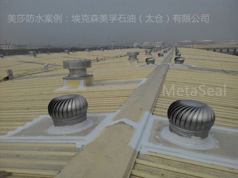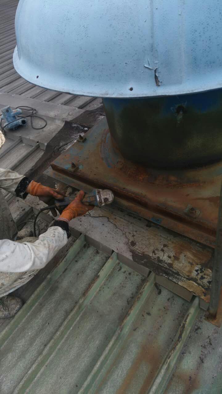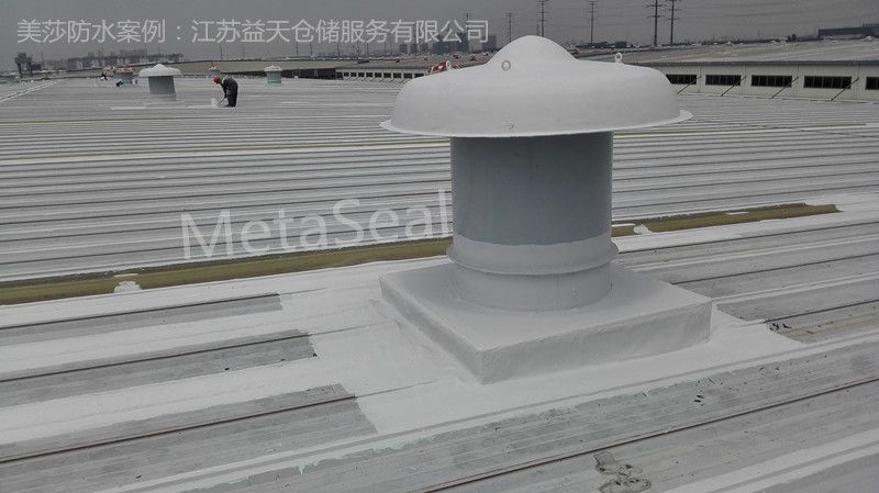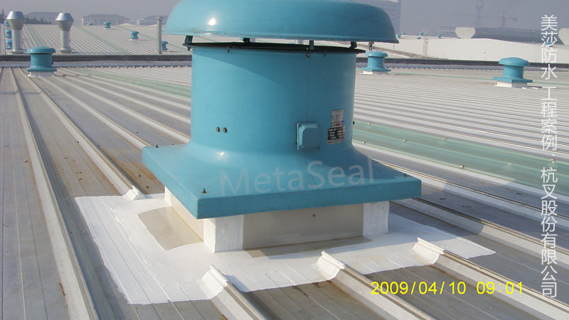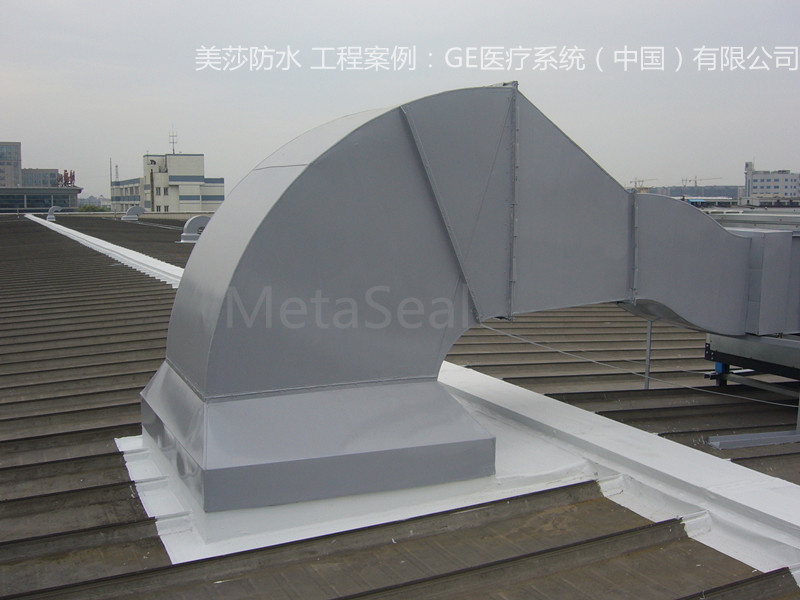 鑒于生產車間的通風功能需求,鋼結構屋面通常會配置各種類型的風機或排風設備,包括無動力風機、電動風機、煙囪、排風管道、條形氣樓等。由于再原有屋面上重新打孔,導致了一定程度上,對原有屋面板造成一定程度破壞,以及造成滲漏水的隱患。在風機煙囪基座的防水處理,從之前的打發泡膠、瀝青、SBS瀝青卷材,以及鋼結構公司常用的丁基膠帶、自粘性卷材、得泰蓋片以及中性硅酮膠,這些防水材料都無法從根本上徹底解決接縫處的漏水問題。