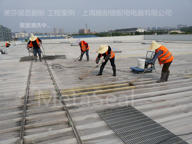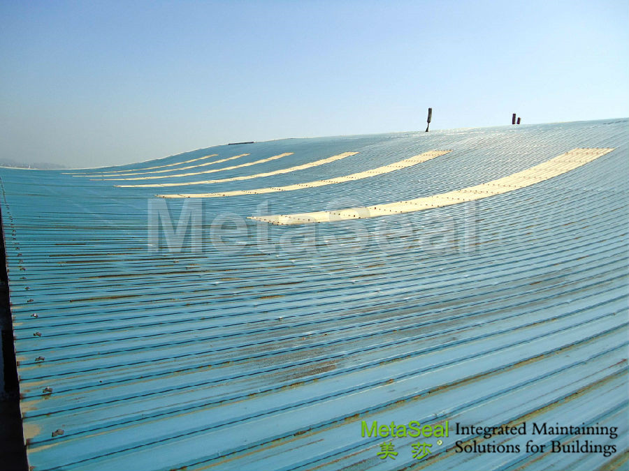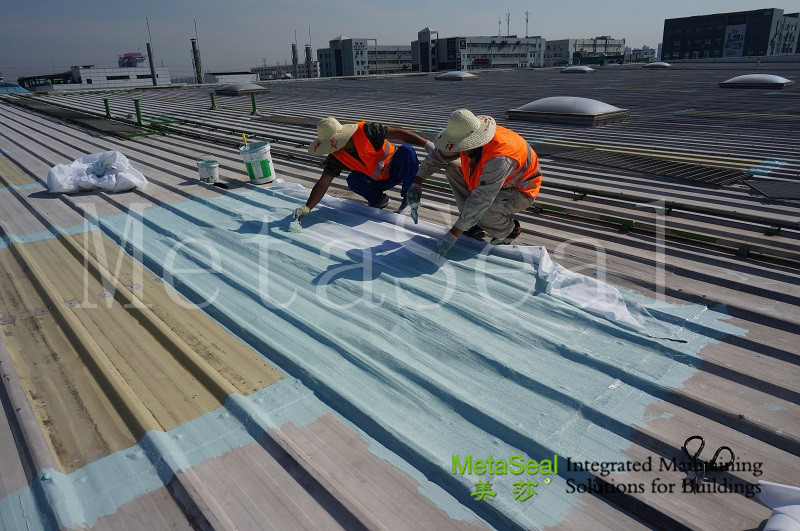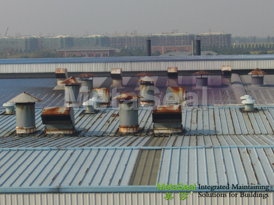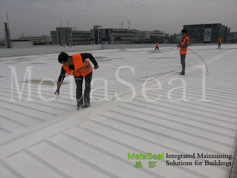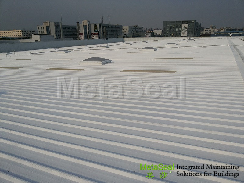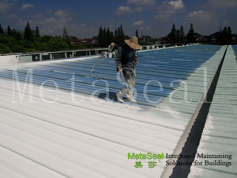 向大家推薦一種新材料新工藝,采用基于美國DOW技術的MetaSeal美莎金屬防水防腐隔熱翻新體系,屬于涂膜型純丙烯酸屋面涂料,液態無縫施工,在不影響工廠正常運營的情況下,對彩鋼屋面進行系統地安裝加固、除銹防腐、局部防水加強,然后再整體隔熱防水防腐節能保護,使得屋面煥然一新,使用壽命長達20年之久。