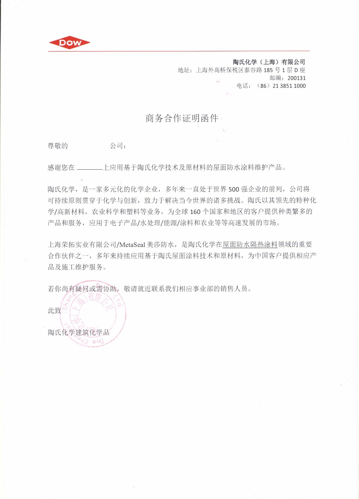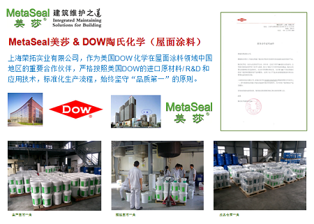 上海榮拓實業有限公司,是美國DOW陶氏化學授權的合作伙伴,為國內提供高品質的美莎純丙烯酸屋面防水隔熱涂料,在眾多世界500強企業,以及大量國有企業、國家重點項目上應用,已超過10年以上。主營產品:純丙烯酸屋面防水涂料,隔熱節能涂料,防腐保護涂料,性能穩固,耐高溫200攝氏度,耐低溫零下50攝氏度,且耐化學腐蝕。最大的特點是可以加水稀釋,無色無味,結膜之后有相稱的彈性和延展性,不會隨著下層的沉降和錯位而斷裂。